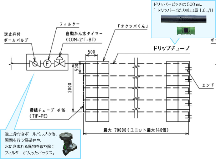 灌水装置につきましてはオクシバくんプラスを設置する形などによって必要な部材が変わります。